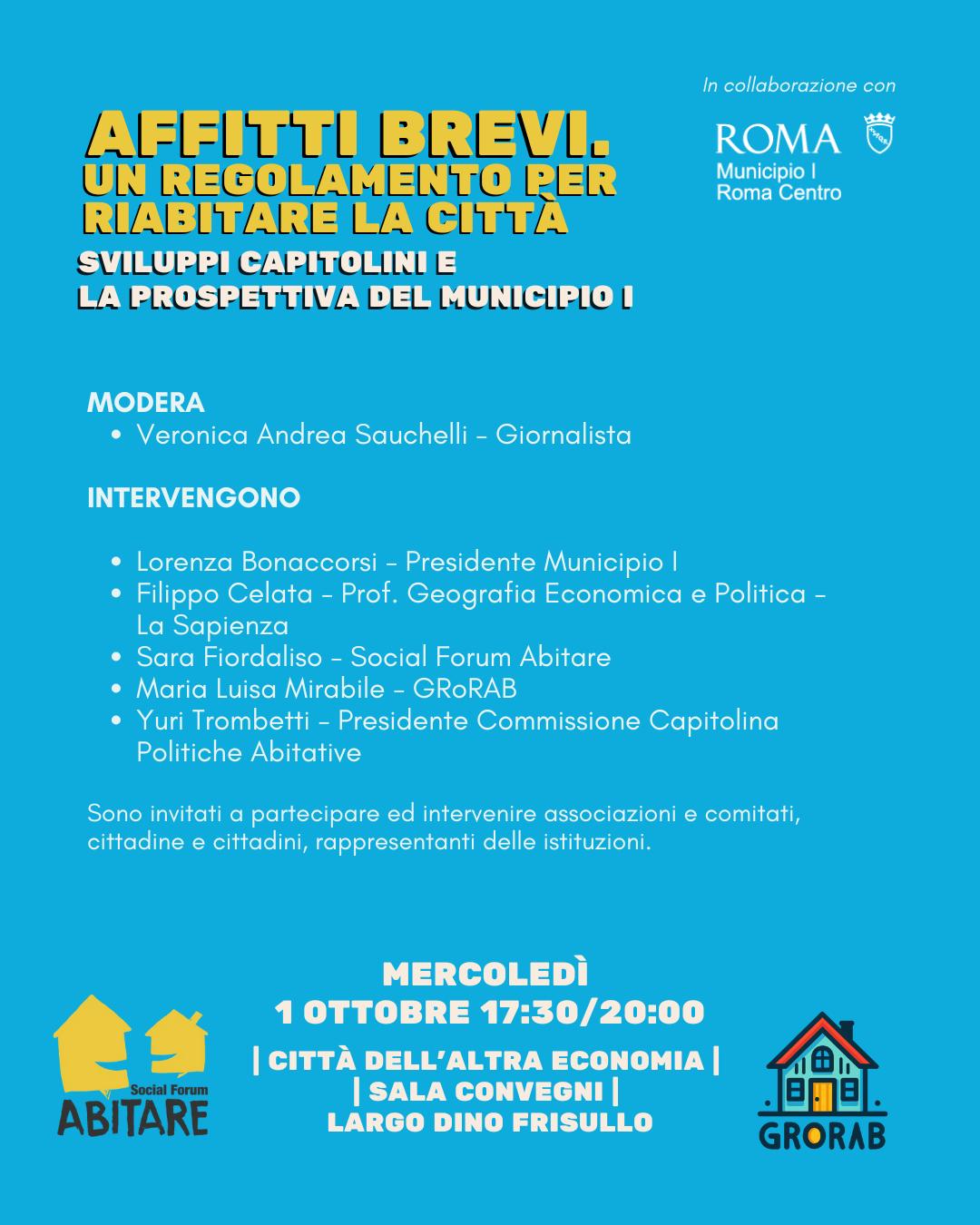Il GRoRAB, Gruppo Romano Regolamentazione Affitti Brevi, è un raggruppamento di Associazioni e Comitati di cittadini che hanno a cuore il futuro di Roma come città accogliente ed economicamente fiorente e perciò preoccupati delle caratteristiche che la città sta assumendo in termini di tipo di sviluppo e qualità della vita per i residenti.